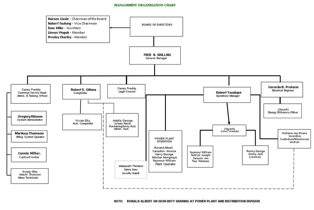 KUA is governed by a five-member board. The Board is appointed to three-year terms by the Governor. The Board has responsibility for all aspects of the Kosrae Utilities Authority. However, since it is an authority created by the State KUA Board members and management maintain a close working relationship with the State Government and present proposed changes in tariffs to the Governor and State Legislature prior to implementation.